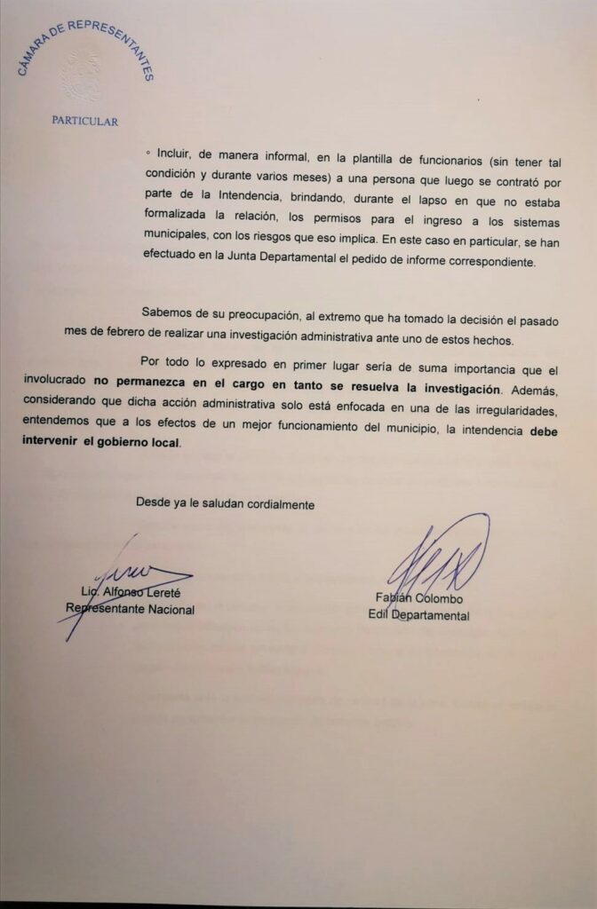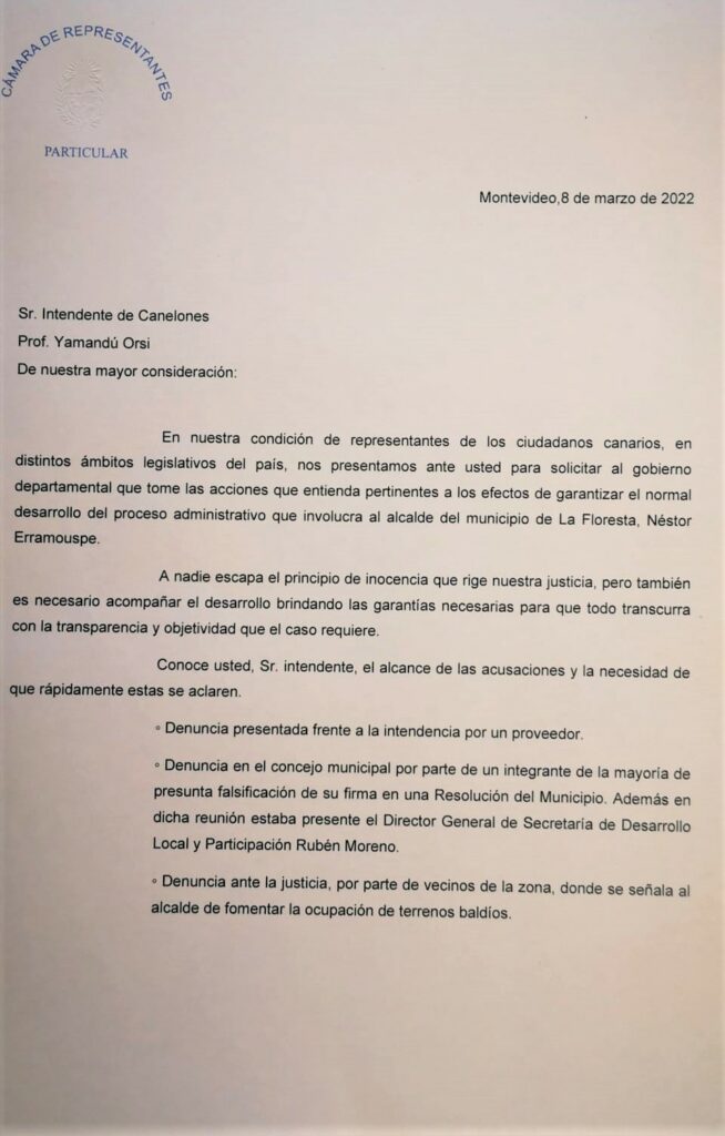 “Ante la acumulación de denuncias contra el alcalde Néstor Erramouspe” que se han realizado por la vía administrativa y alguna por la judicial, el diputado nacionalista Alfonso Lereté y el edil Fabián Colombo entregaron en mano al Intendente Yamandú Orsi el pedido de intervención del gobierno de La Floresta.