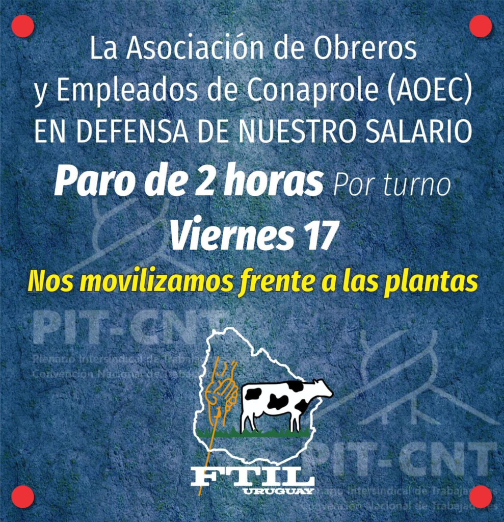 Como parte de las medidas de fuerza de un conflicto de meses con la Industria Láctea, los trabajadores se manifestarán este viernes frente a la planta de Conaprole en Ruta 5