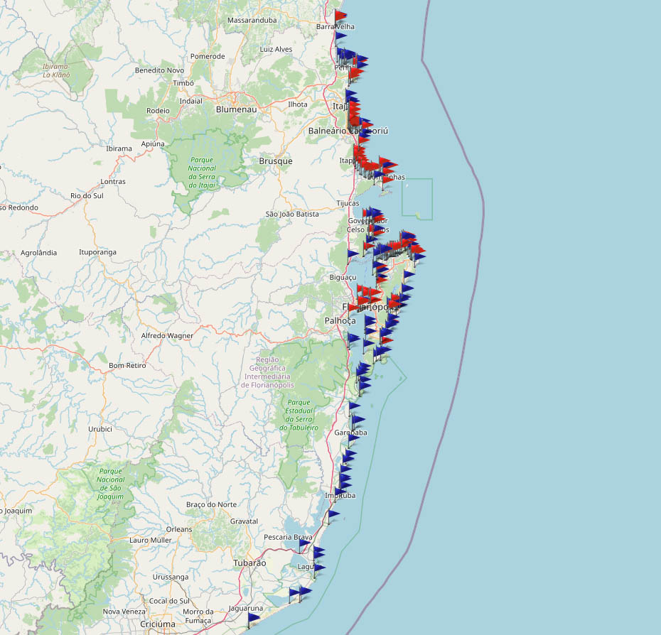 En el mapa del sitio https://balneabilidade.ima.sc.gov.br/ , se pueden ver en tiempo real las playas aptas para baño marcadas con la banderita azul y las rojas están con alto riesgo para los bañistas por elevados niveles de coliformes.