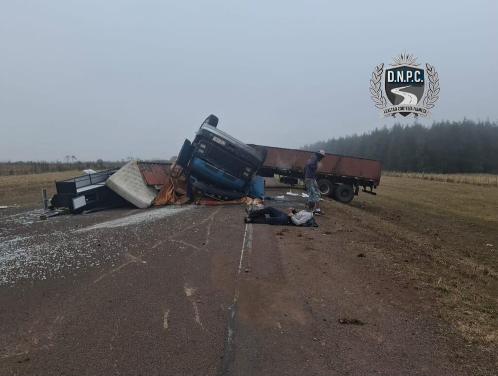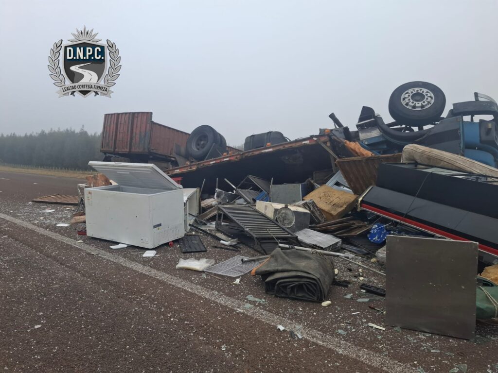 Y en 5 cinco, pero a la altura de Tacuarembó, un camión con carga completa de lo que parece ser una mudanza, volcó también por razones que se desconocen al momento, pero su conductor sólo sufrió lesiones leves