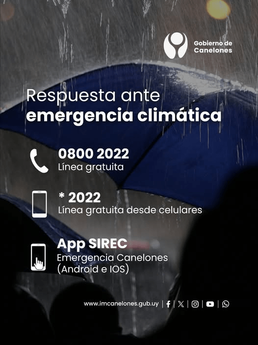 “La racha de viento más fuerte fue registrada en la estación ubicada en Atlántida y fue de 74 km/h. Santa Lucía fue la ciudad donde más llovió, el pluviómetro marcó 32 mm. El promedio en el resto del departamento estuvo entre los 20 y 30 mm”.