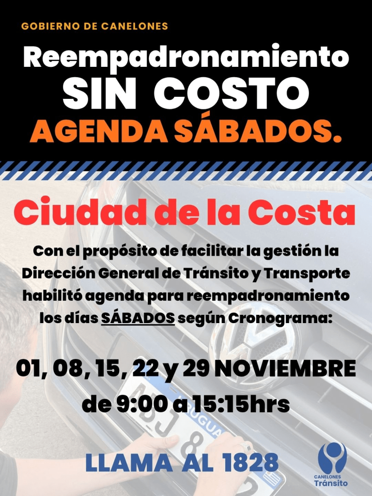 La Intendencia de Canelones habilita el reempadronamiento de vehículos sin costo los días sábado en Ciudad de la Costa durante noviembre.