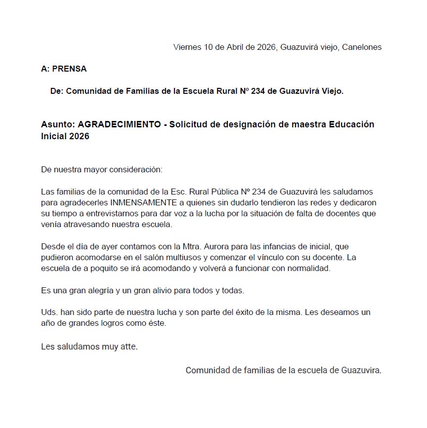 Desde la comunidad agradecieron a los medios que informamos sobre el tema y anunciaron “con alegria y un gran alivio para todos y todas”, la designacion de “la maestra Aurora para las infancias de inicial que pudieron acomodarse en el salon multiusos y comenzar un nuevo vínculo con la docente”